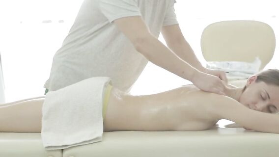 Приятная обстановка, голая красивая девушка в масле лежит на его столе. Массаж для неё закончится только сексом, он устроил для неё красивый нежный анал под звуки её приятных стонов.