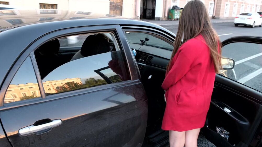 Русский парень подкатил к незнакомке на машине и пригласил её к себе. Очкастая девушка брюнетка в белых кроссовках и коротких шортах всё понимала и была не против качественного секса.