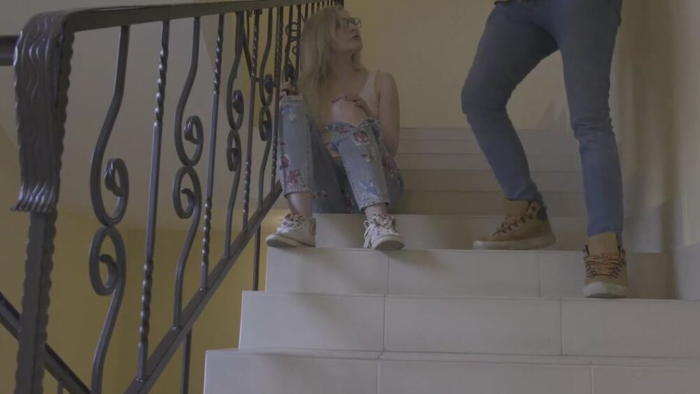 Юная красивая девушка в очках, сидела расстроенная в подъезде, когда её нашел сосед. Он пригласил её к себе и утешил, занявшись с ней жестким сексом на большой кровати, и кончил камшотом на лицо.