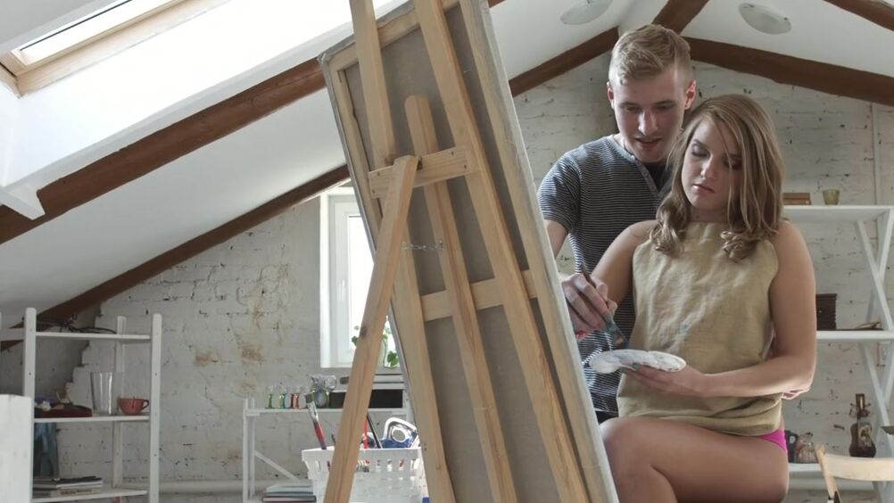 Красивая загорелая русская шатенка ищет вдохновение для картины и находит его в анальном сексе со своим парнем. Их соитие на полу и диване, дарит ей наслаждение, а ему возможность кончить ей в попу.