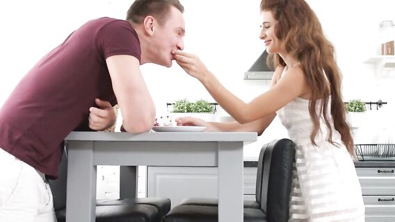 В благодарность за завтрак, русский парень занялся сексом с 20-летней брюнеткой на кухне. После приятных оральных ласк, он трахнул её в гладкую бритую киску и маленькую попочку, кончив ей на сиськи.
