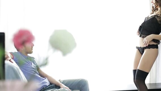 Потрясающая русская красавица дразнит парня стоя перед ним в чулочках и пеньюаре, она возбудила его вагинальным сексом, а потом села на большой член попочкой, заставив его быстро достигнуть оргазма.