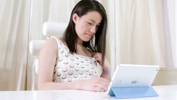 Разговаривая с парнем по видео связи, юная русская девица разделась, но не дала ему посмотреть, как она занимается соло самоудовлетворением свой бритой киски на стуле и позже на столе.