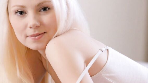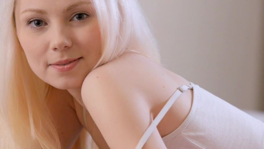 Когда с плеча падает тонкая лямка топа, русская худая блондинка начинает свои ласковые возбуждающие игры со своим телом и скоро она мастурбирует обнаженная, лежа на кровати, трахая себя пальцами.
